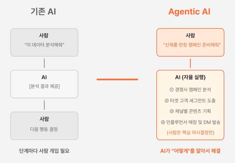 실행 능력: 일반 AI는 제안만 제공하지만, AI Agent는 승인된 범위 내에서 직접 실행합니다. 광고 예산 조정이 필요하다고 판단하면 실제로 광고 플랫폼에 접속해 예산을 변경할 수 있습니다.